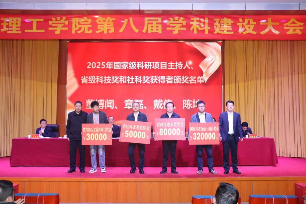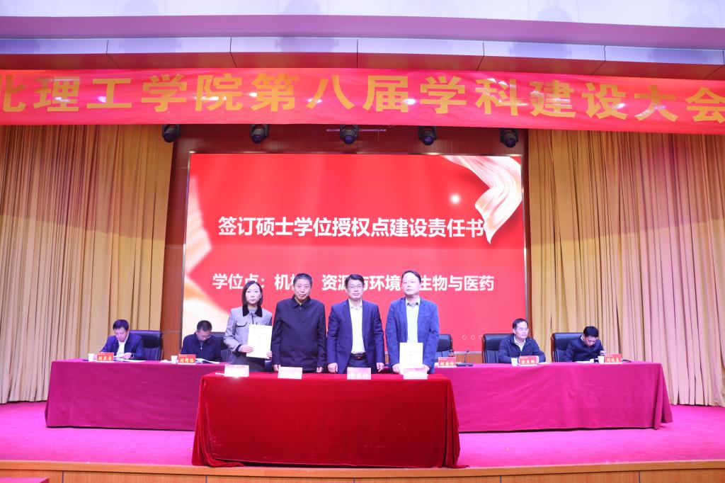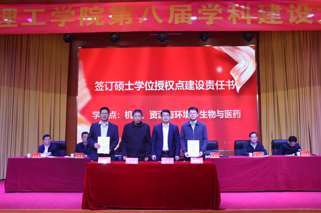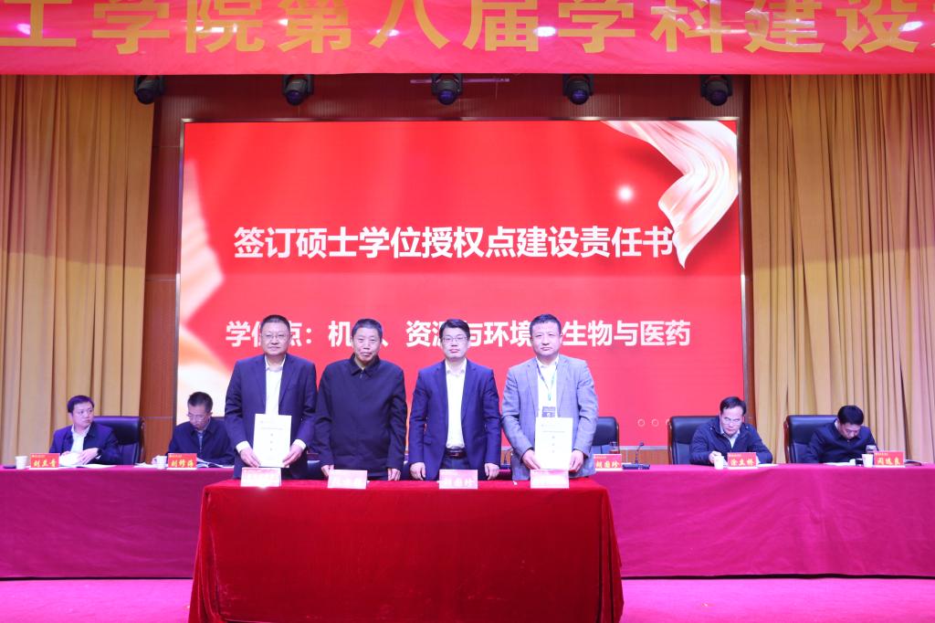 张方胜书记、胡国珍校长与机械、资源与环境、生物与医药三个专业硕士学位授权点牵头学院党总支书记、院长签订建设责任书,为2025年国家级科研项目主持人、省级科技奖和社科奖获得者颁奖。
