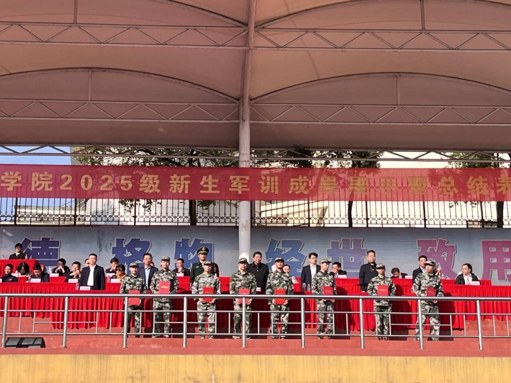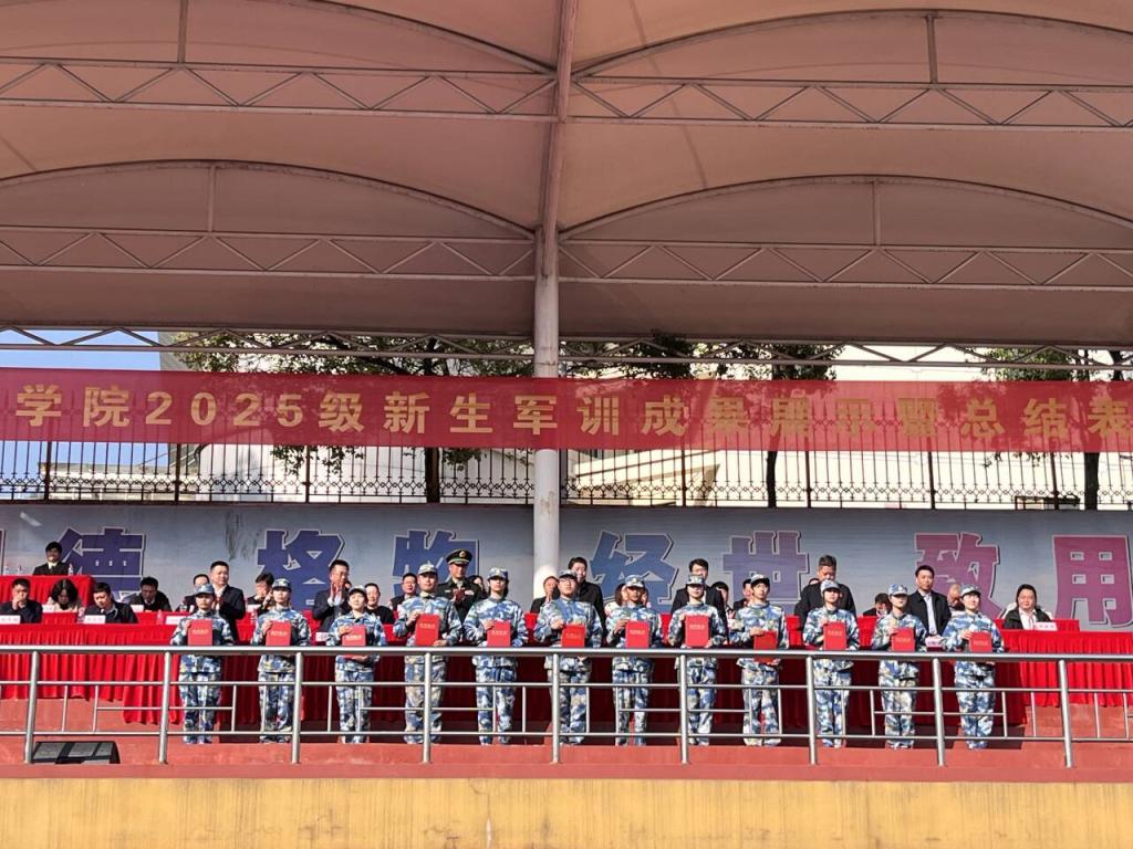 表演结束后,校长胡国珍向承训部队武警黄石支队赠送锦旗。校领导为新生军事训练优胜单位、优秀教官、优秀辅导员、优秀学员颁奖。冯运仿宣读2025级新生军训表扬文件。