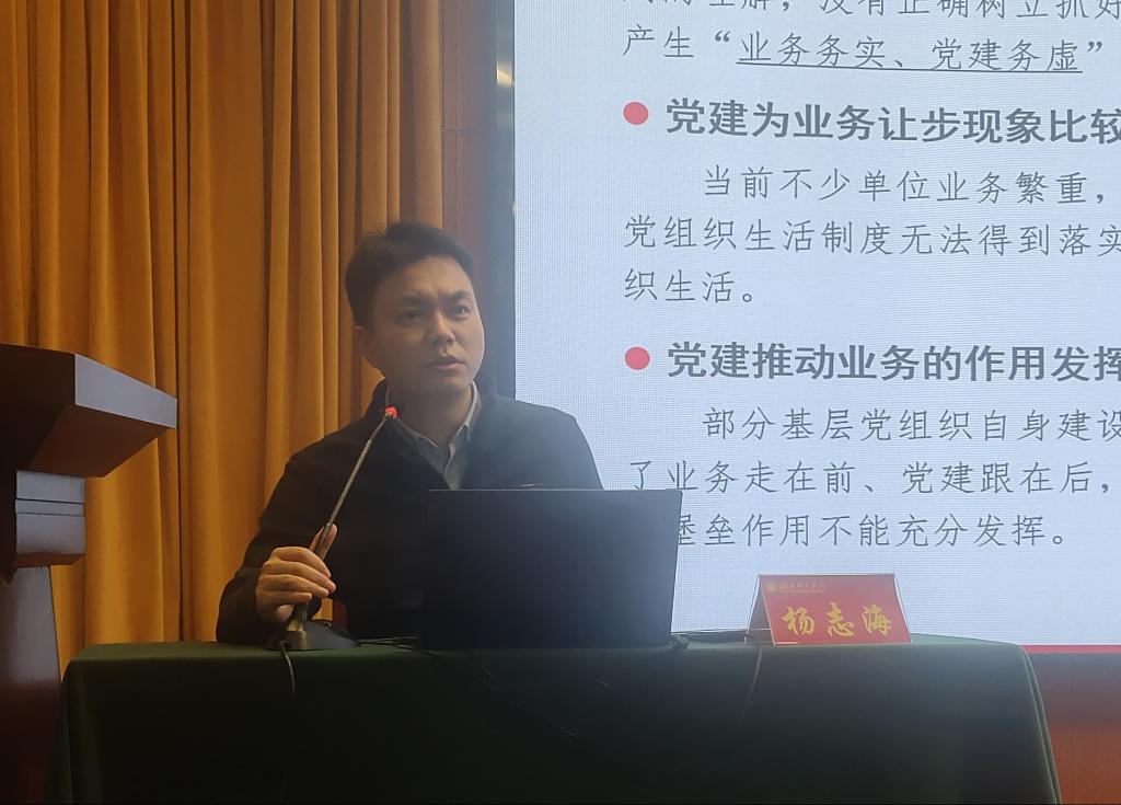 党委组织部副部长潘俊以党支部工作存在的普遍性问题与不足为切入点,围绕党支部的基本任务、工作机制、组织生活、组织发展等方面进行了党支部书记工作实务辅导。